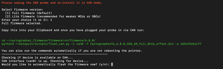 it will then run through and flash the Katapult Deployer firmware, this will switch the probe from USB to CAN Bus.